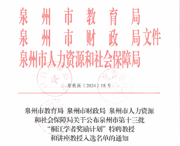 近日,泉州市教育局发文公布2024年入选泉州市第十三批“桐江学者奖励计划”特聘教授和讲座教授名单,我校推荐申报的叶翀、林歆悠、张陈涛3位专家入选2024年泉州市“桐江学者奖励计划”讲座教授。至此,我校“桐江学者奖励计划”讲座教授增至5名。
