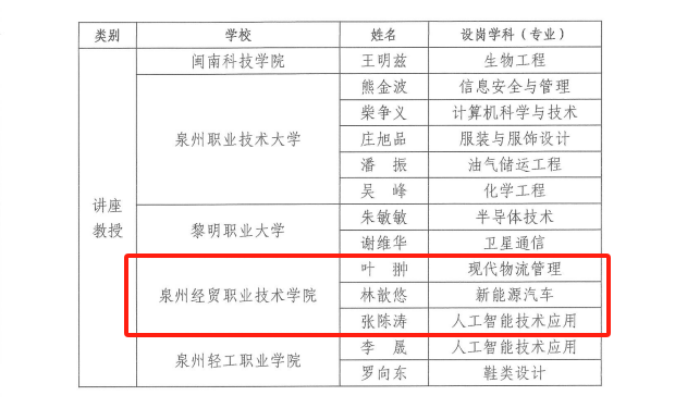 此次新增3人,集中体现了我校以“投入揽才”为导向,贯彻落实“人才兴校”战略,为持续深化“一谱三阶”育人模型、打造“双师型”师资队伍注入了新力量。我校将继续结合泉州产业和学校发展实际需求,积极用好各项人才政策,加大力度引进、培养一批具有影响力的专业领军人才,为推动学校专业建设与泉州经济社会发展提供更好的人才服务和智力支撑。
